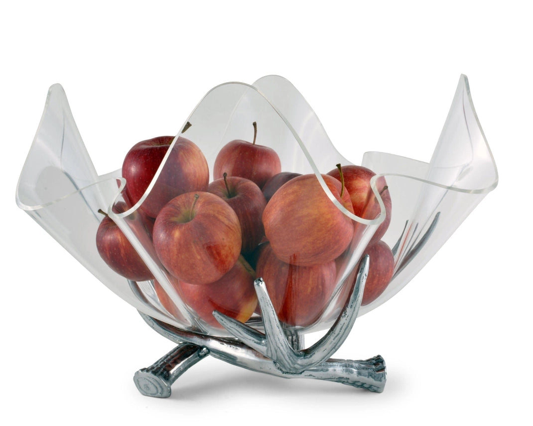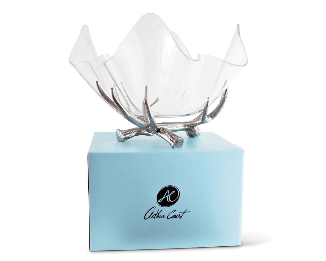 Attract anyone's eye with this uniquely crafted Acrylic Antler Stand Bowl from Arthur Court. Crossing antlers give the visual appeal of firewood to the base, while the acrylic sits comfortably on top.