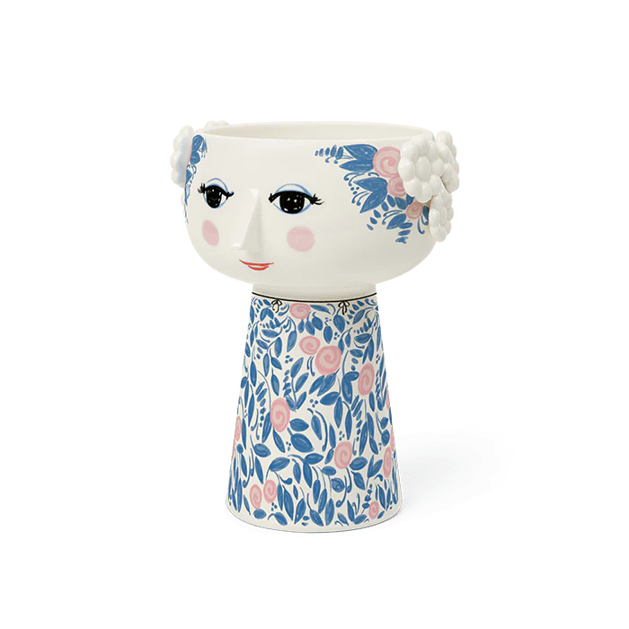 Bjørn Wiinblad embodies everything quirky, whimsical, creative, and wonderful. With the beautiful and smiling Eva vase from Bjørn Wiinblad, featuring vibrant green hair, a blue pearl necklace, and a colorful dress in green with pink hues, you can bring a touch of whimsy into your home. The vase stands 9.3" tall with a diameter of 6.9" and is made of glossy glazed ceramic. The face, with almond-shaped eyes and a pointed nose, reflects Wiinblad's original design, while the colorful dress pattern reinterprets illustrations from Bjørn Wiinblad's archives.
