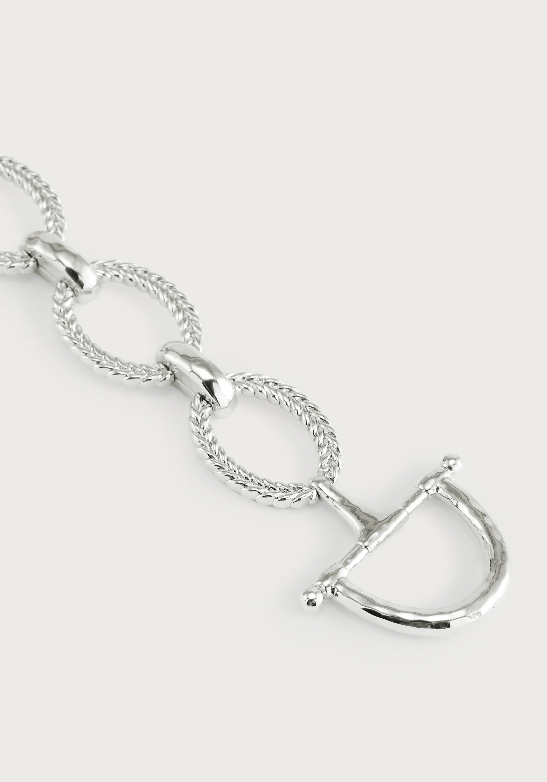 The Cheval Chain Bracelet captures the artistry of hand-braided reins in sterling silver plated links that catch the light with every movement. An equestrian-inspired horse bit clasp serves as both functional hardware and sculptural detail, nodding to the collection's heritage. This refined piece brings timeless stable elegance to your everyday or evening look.