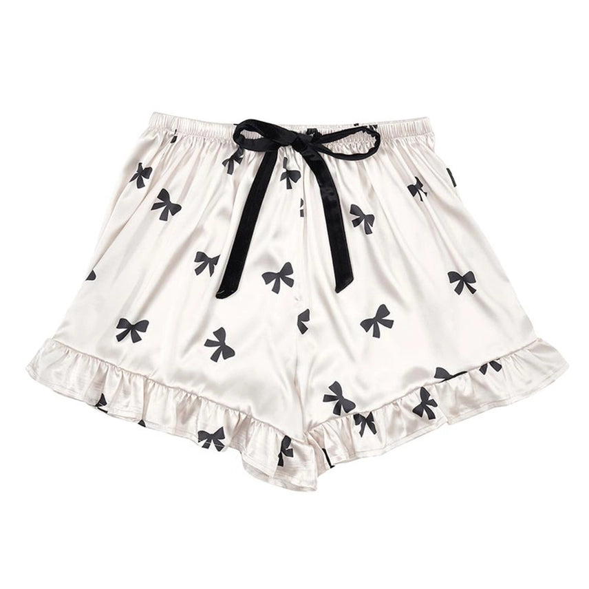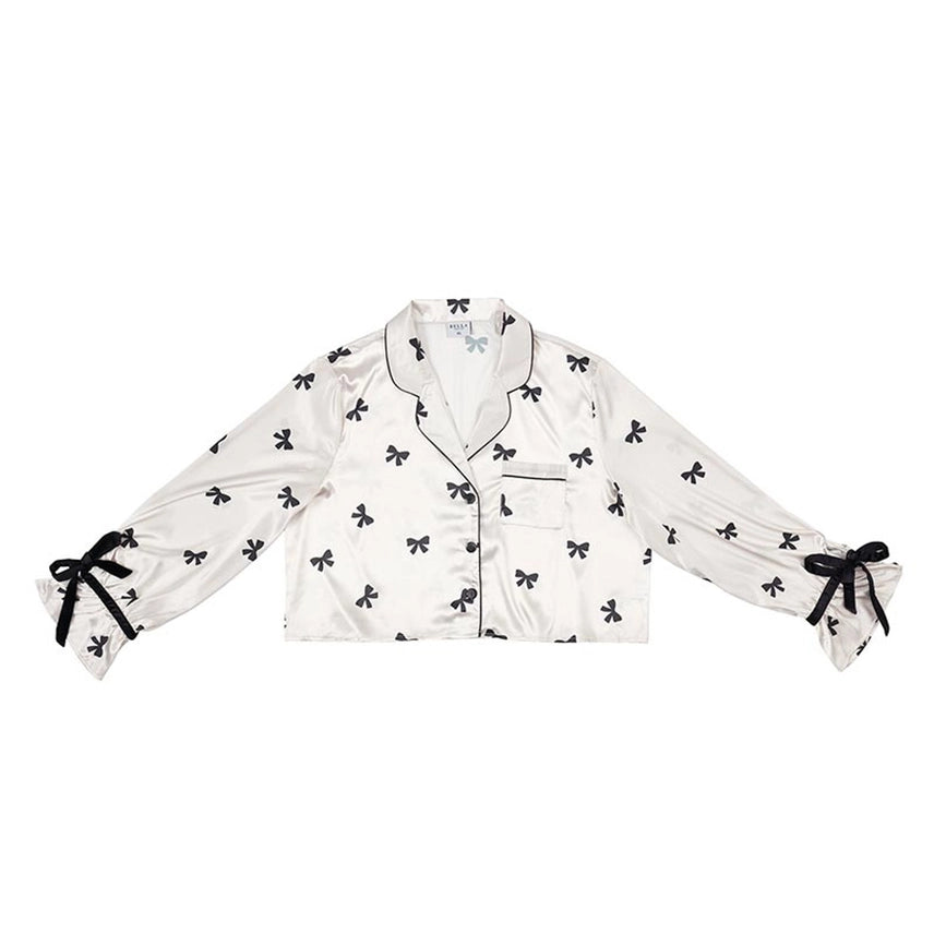 You never know who you'll meet in your dreams! ivory Black Bow silky satin pajamas are perfect for cozy nights in, slumber parties, or lazy Sunday mornings.
