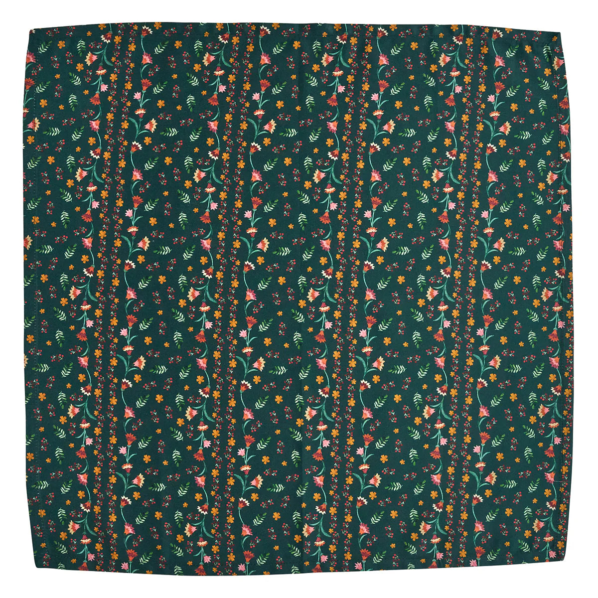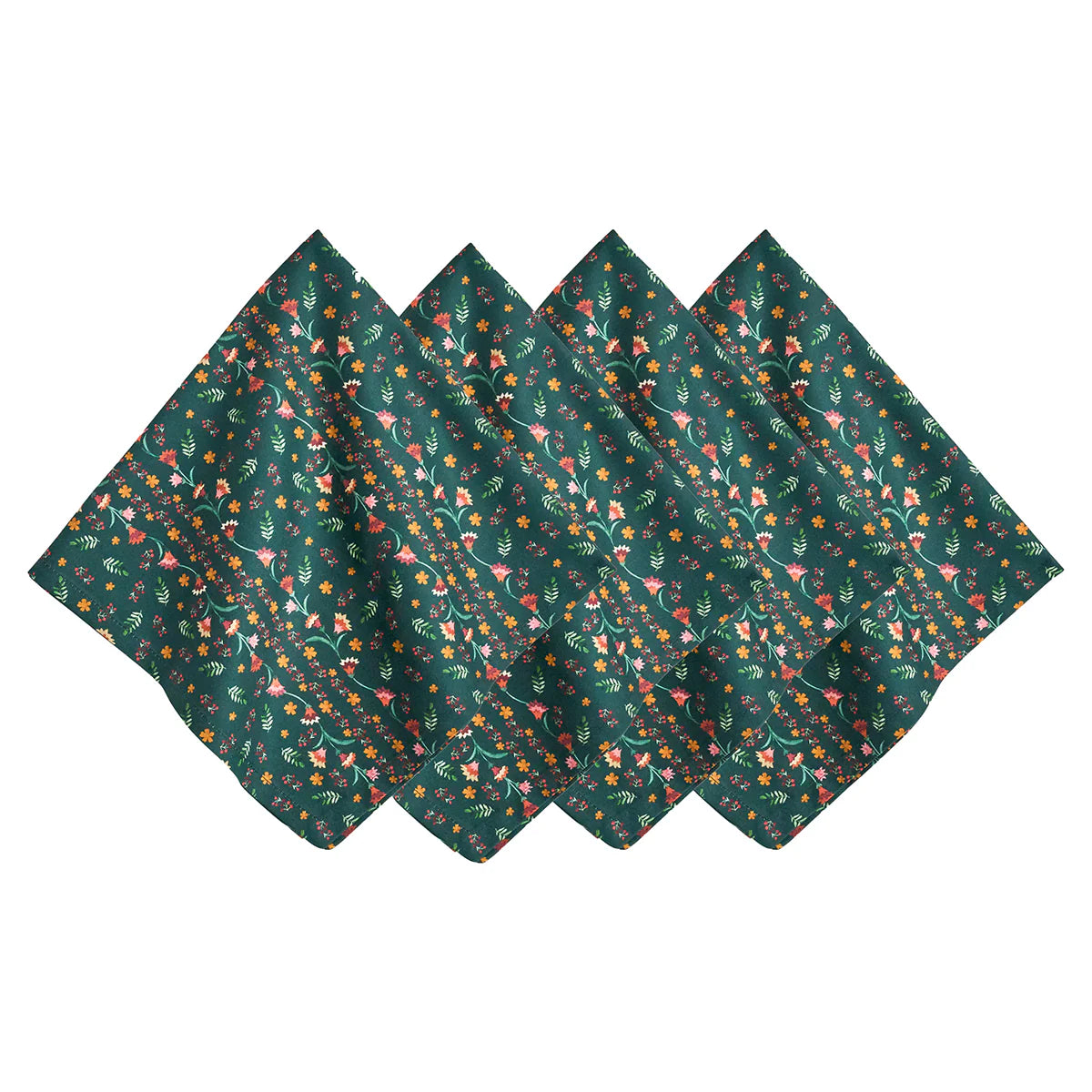 Four cotton napkins was inspired by charming Alpine chalets—as cozy as they are sweetly elegant—with colorful mountain wildflowers upon a deep, evergreen background.
