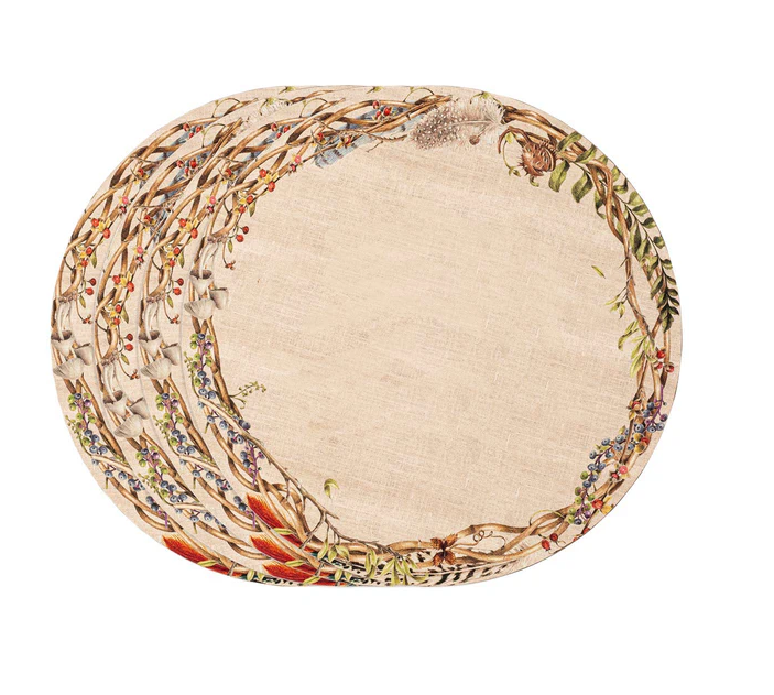 As if framing your dinnerware within a nest of wind-swept elements found in the forest, this easy-care placemat makes a pretty picture for autumnal table settings, while making cleanup a breeze. Wipe with clean, damp cloth